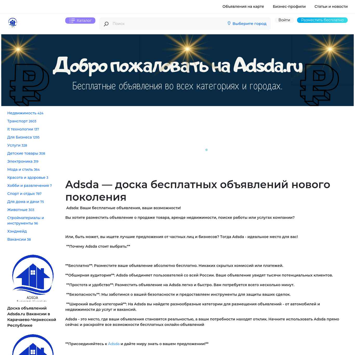 | Описание сайта (description) | Adsda - это удобная и простая в использовании доска объявлений, где вы можете разместить объявления о продаже или покупке товаров и услуг абсолютно бесплатно. На нашей платформе вы найдете широкий выбор категорий, от недвижимости и автомобилей до услуг и вакансий. Разместите свое объявление прямо сейчас и найдите то, что вам нужно быстро и легко на Adsda.ru |