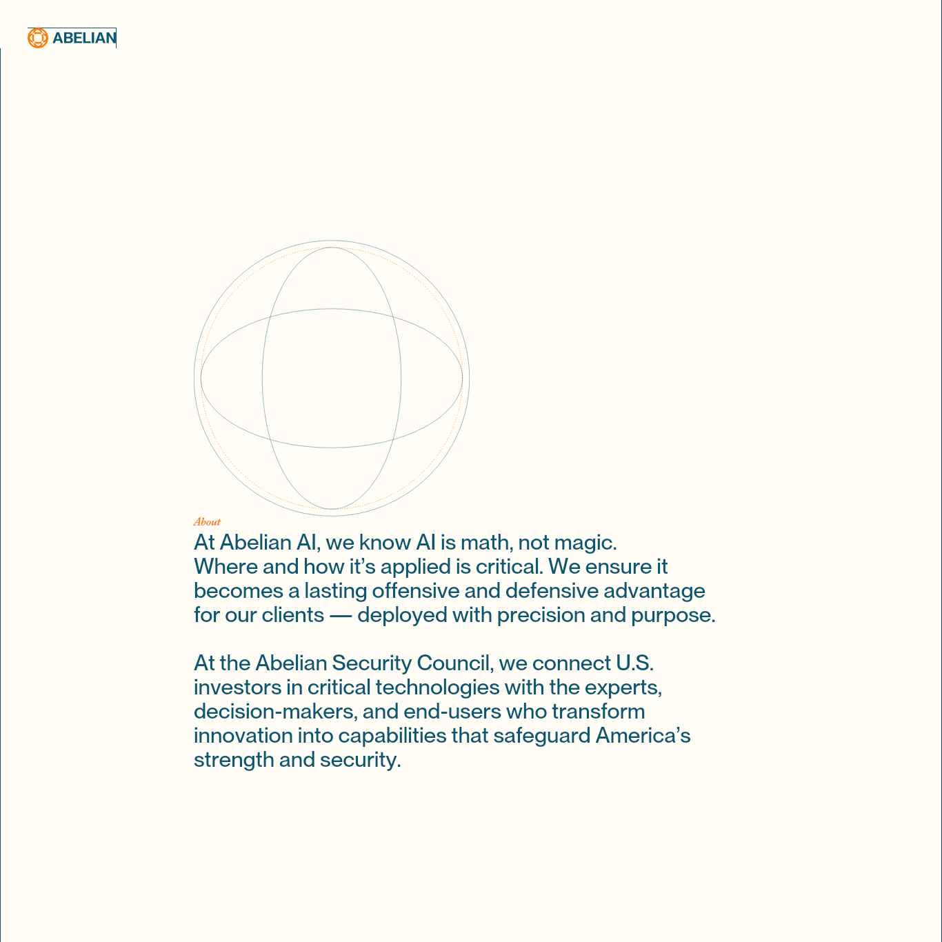 | Заголовок (тег h1) | At Abelian AI, we know AI is math, not magic.Where and how it’s applied is critical. We ensure it becomes a lasting offensive and defensive advantage for our clients — deployed with precision and purpose.At the Abelian Security Council, we connect U.S. investors in critical technologies with the experts, decision-makers, and end-users who transform innovation into capabilities that safeguard America’s strength and security. |