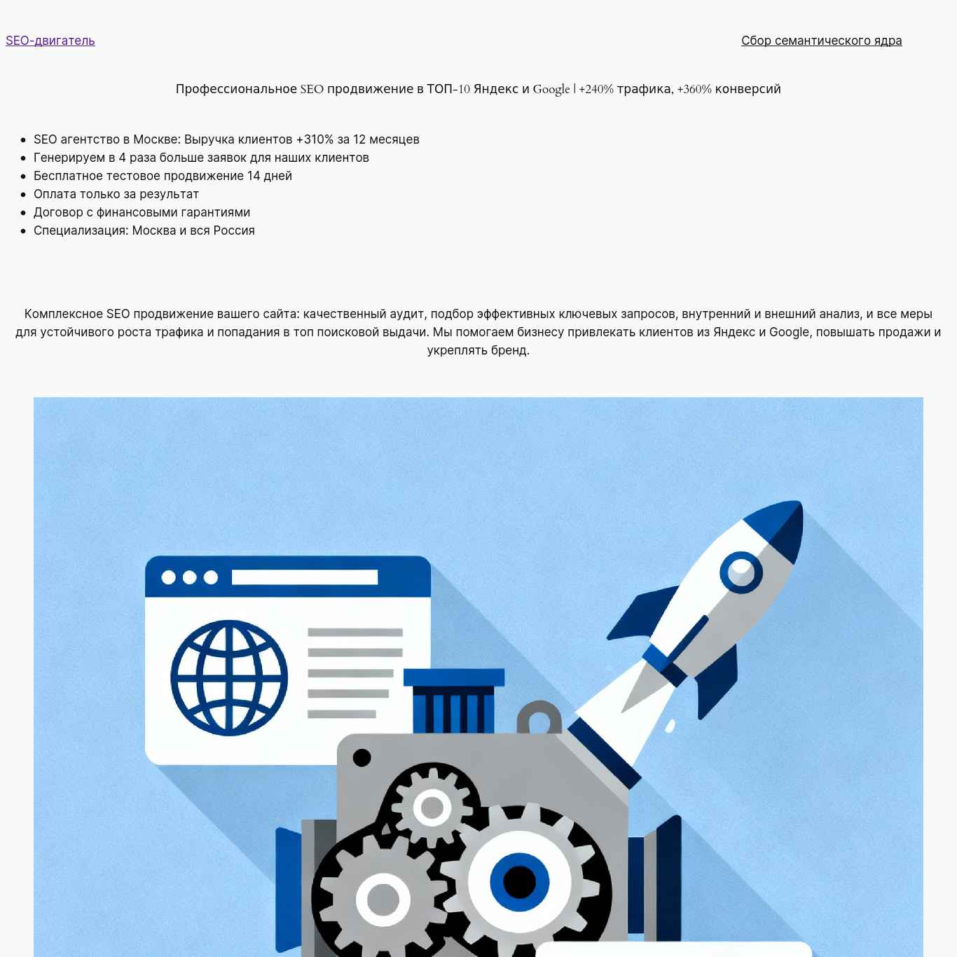 | Заголовок (тег h1) | Профессиональное SEO продвижение в ТОП-10 Яндекс и Google | +240% трафика, +360% конверсий |