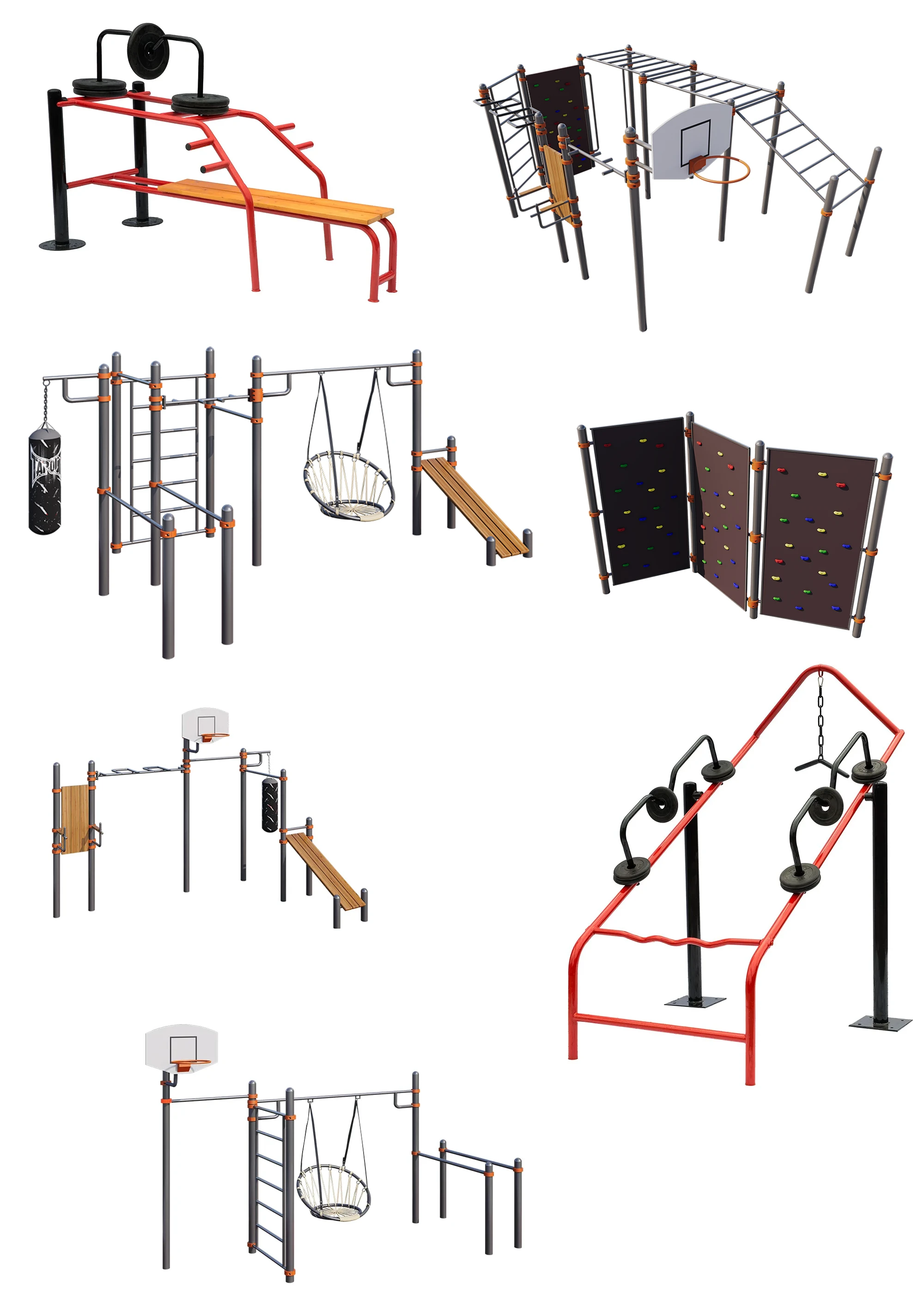 Это специализированные уличные спортивные сооружения для занятий функциональным тренингом и силовыми упражнениями. Обычно включают в себя несколько элементов: турники разной высоты для подтягиваний, брусья для отжиманий и упражнений на трицепс, шведские стенки для растяжки и укрепления мышц, а также различные перекладины и рукоходы для развития координации и силы хвата. Воркаут комплексы могут иметь дополнительные элементы, такие как скамьи для пресса, кольца и канаты для лазания. Их конструкция рассчитана на интенсивные тренировки с собственным весом тела и делает такие площадки универсальными для людей разного уровня подготовки. Благодаря разнообразию элементов воркаут комплексы способствуют комплексному развитию мышц и улучшению выносливости.